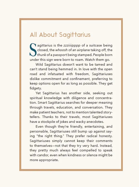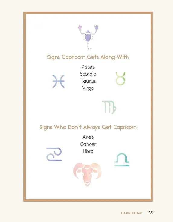 • Fun bonus material includes a sun sign yearbook page, a zodiac compatibility matrix, lists of famous duos and their zodiac signs, and career ideas for each sign.