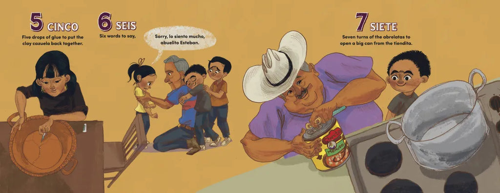 Sundays are the best: that’s when a little girl and her mamá, abuelitos, tías and primos all gather together to eat yummy menudo, a traditional Mexican soup. But when playtime with the cousins and family dogs gets out of hand and Abuelito Esteban’s special bowl of menudo breaks, everyone has to pitch in to make a new batch! Through all the menudo mishaps and sneaky snacks for perritos with wagging tails, young readers will giggle as they learn to count from 1-15 in Spanish and English. Bonus materials at the back of the book include a glossary of Spanish words, a note from the author, and tips for hosting your very own Menudo Sunday!