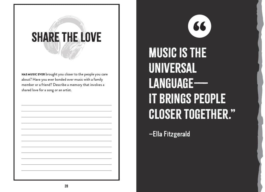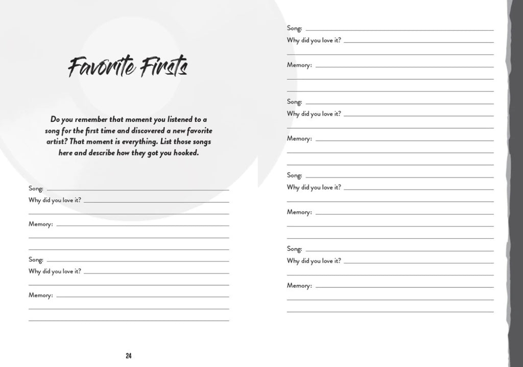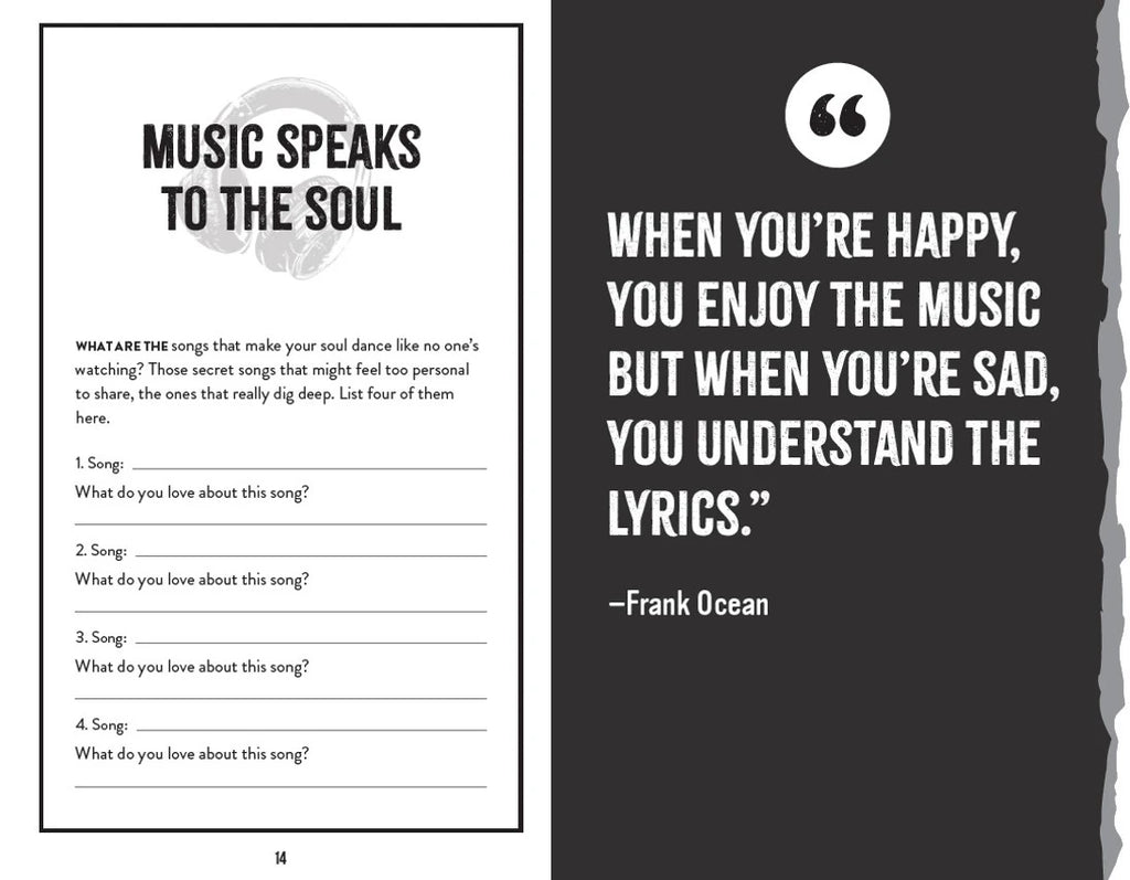- Creative prompts for music fans to reflect on their favorite songs, lyrics, and artists and why they mean so much to them.