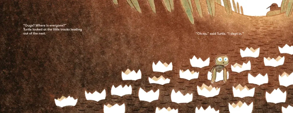 Turtle slept in — and all her siblings already hatched and made it to the sea. Now she must journey across the beach and navigate shoddy sandcastles, stomping feet, and hungry seagulls to reach the water.