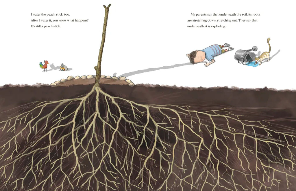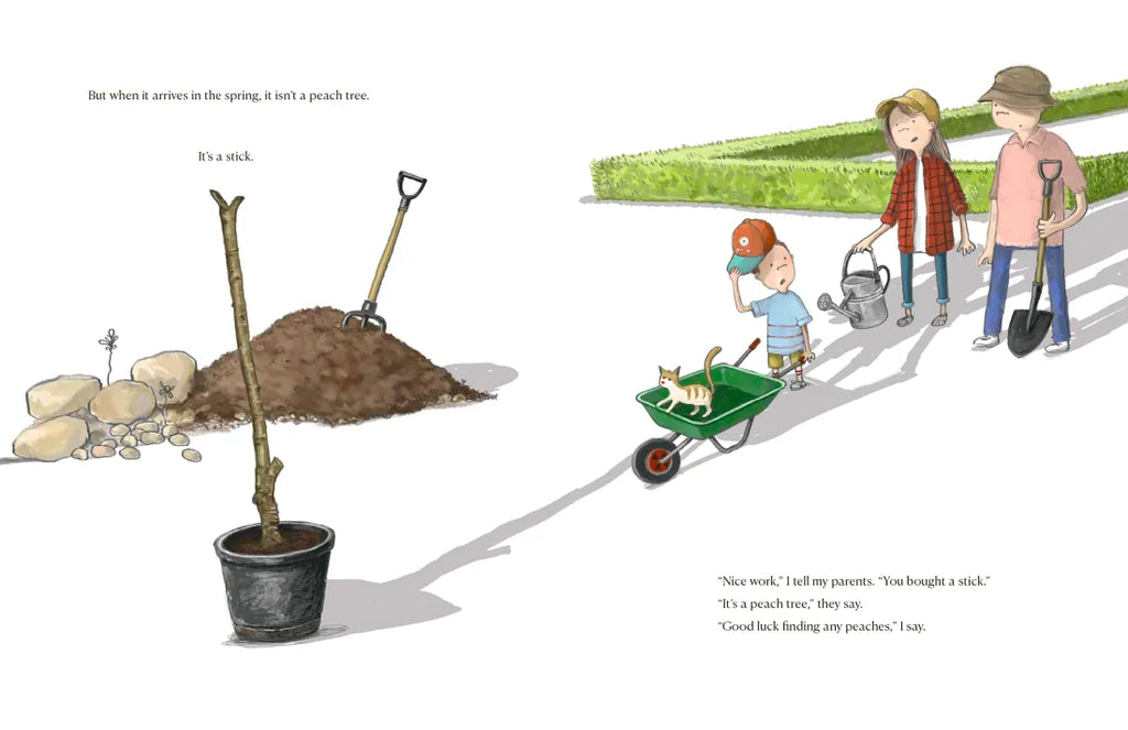 But when the tree arrives in the spring, it isn’t a tree. It’s a stick. Nice work, the boy tells his parents. You bought a stick. Even his friend Maya agrees. It’s a stick.