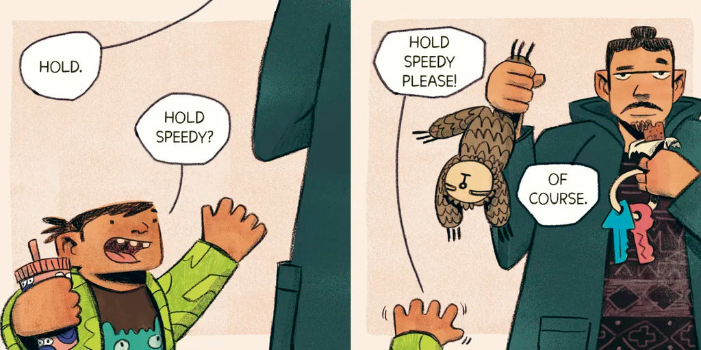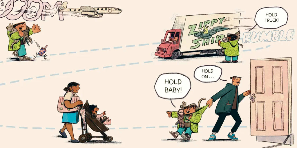 It's time to leave the house, but...where are the keys?? As Daddy rummages through the mess, he hands a water bottle to his toddler and says, "Hold, please." This accidental request turns into an adventure when the child decides holding is fun and wants to hold EVERYTHING!
