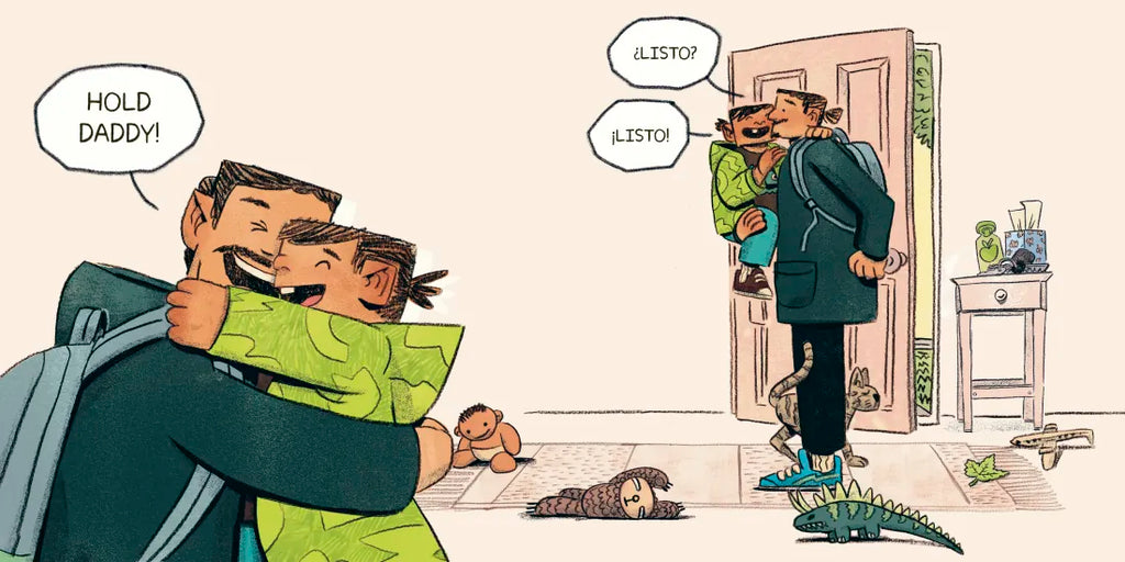 Before long, the toddler has their arms full with their favorite stuffie, toy plane, even the family pet, and has set their sights on more ambitious items—the rain, a tree, and more—until it becomes too much to hold. Luckily, Daddy's always there to hold them.