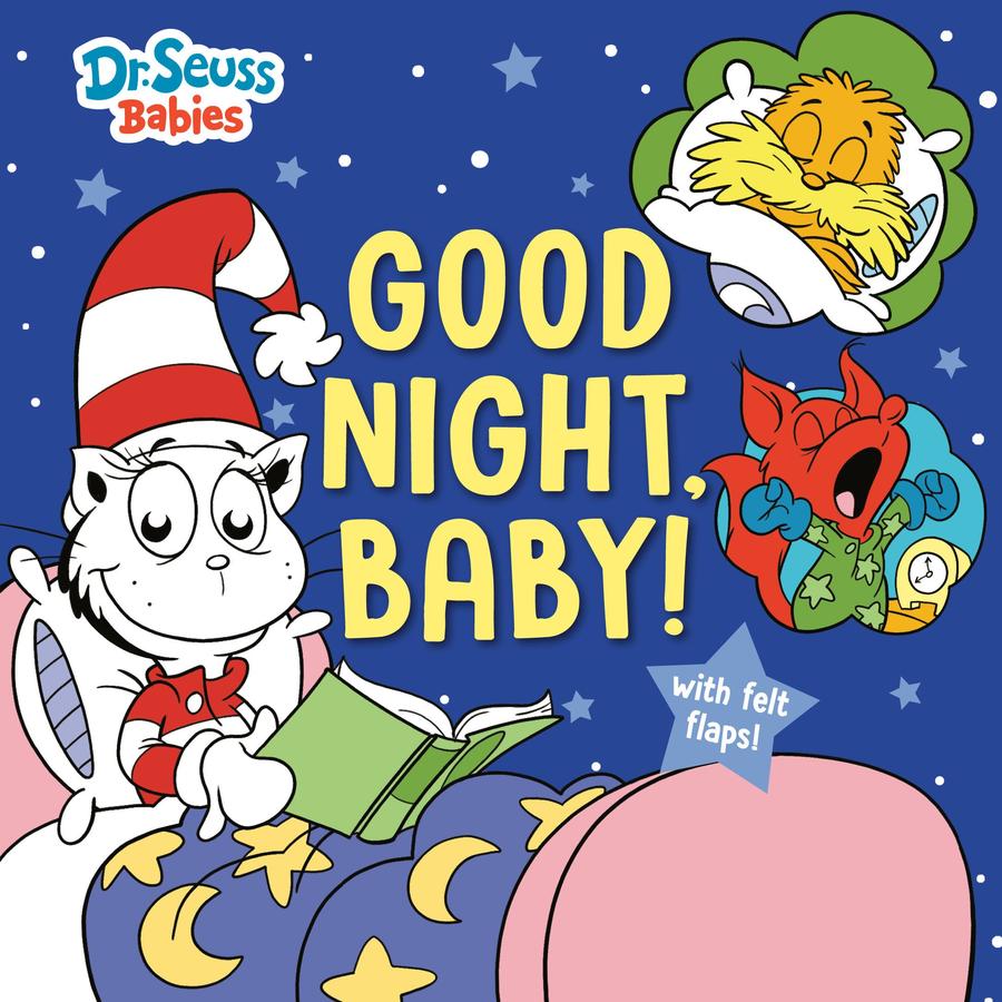 Get ready for bed with Baby Cat in the Hat, Baby Sam-I-Am, Baby Lorax, and more of the Dr. Seuss Babies! This adorable board book with felt flaps is perfect for nighttime reading.