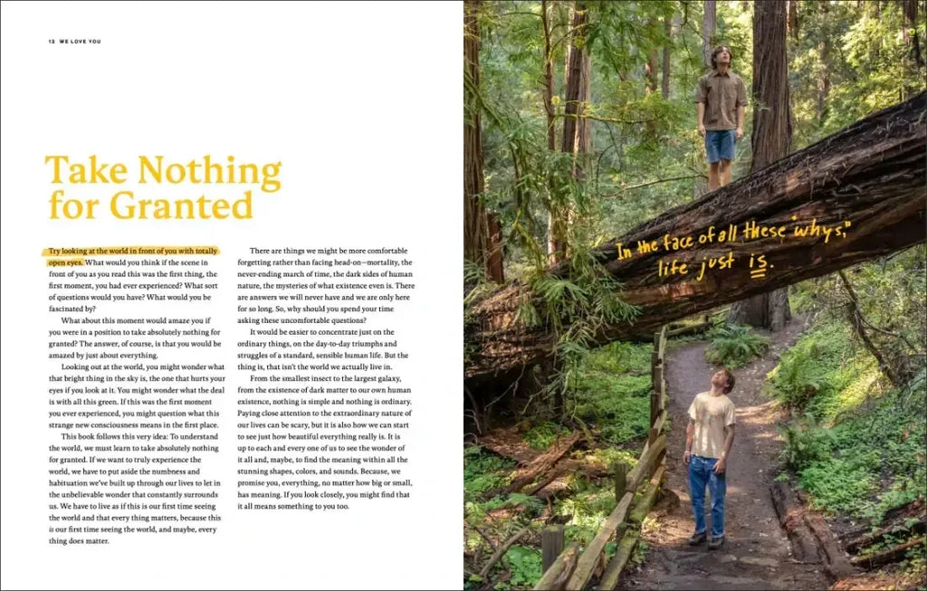 In this reflective and adventurous book, Andy Min and Thomas Sullivan (the optimistic guys behind the We Love You channel) challenge you to reconsider the way you see the world and what it means to live on Earth. Through poems, essays, narrative scenes, and more, the guys will lead you on a journey to deepen your relationship with nature—scratch that . . . your relationship with yourself—scratch that . . . your relationship with everything.