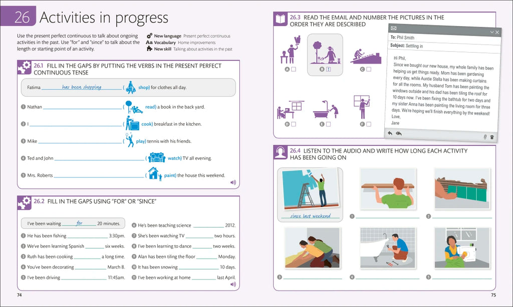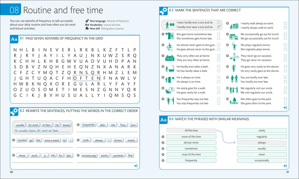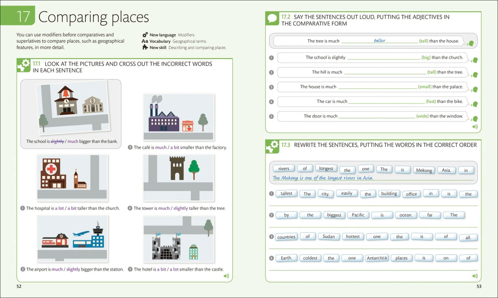This course book has eye-catching illustrations and step-by-step explanations, keeping content straightforward for easy learning. Activities cover listening, speaking, reading and writing skills, and include filling in the blanks, true or false decision-making, matching the pairs, word searches, and much more. All teaching is supported by extensive audio materials, with clips recorded by native English speakers to teach the perfect pronunciation.