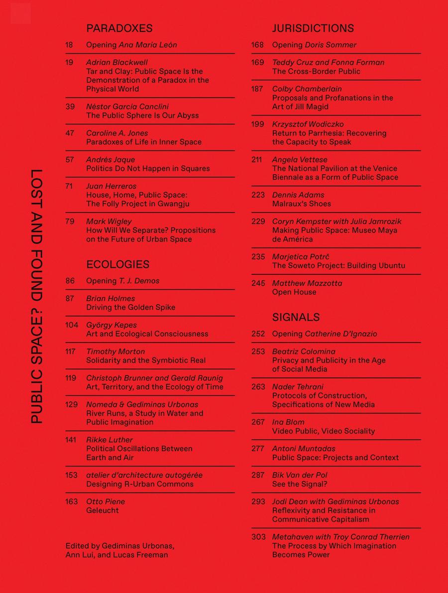 atelier d'architecture autogérée, Dennis Adams, Bik Van Der Pol, Adrian Blackwell, Ina Blom, Christoph Brunner with Gerald Raunig, Néstor García Canclini, Colby Chamberlain, Beatriz Colomina, Teddy Cruz with Fonna Forman, Jodi Dean, Juan Herreros, Brian Holmes, Andrés Jaque, Caroline Jones, Coryn Kempster with Julia Jamrozik, György Kepes, Rikke Luther, Matthew Mazzotta, Metahaven, Timothy Morton, Antoni Muntadas, Otto Piene, Marjetica Potrč, Nader Tehrani, Troy Therrien, Gedminas and Nomeda Urbonas, Angela Vettese, Mariel Villeré, Mark Wigley, Krzysztof Wodiczko