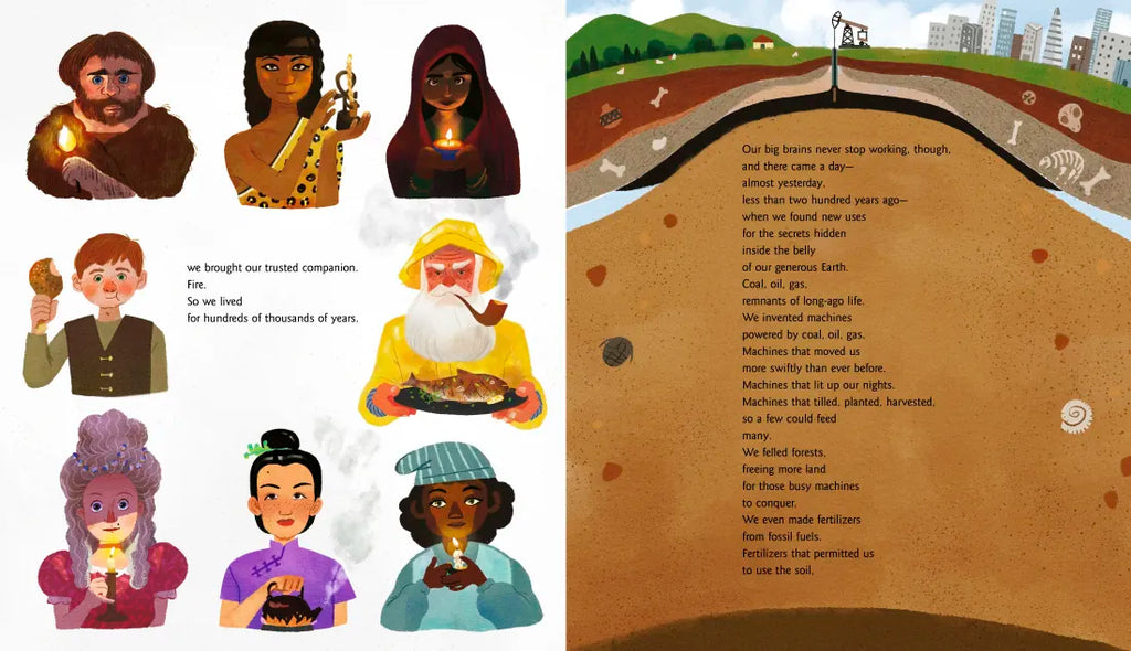 Born without fangs, claws, or wings, naked of fur or feathers, humans are the most vulnerable of Earth’s creatures. Our strength rests in our knowing. Early on, we put our big brains to work to tame fire, and over eons, our discovery helped us grow. Just two centuries ago, we began using coal, oil, and gas—remnants of long-ago life hidden deep within a generous Earth—to fuel fire, light up our nights, and run machines. Fertilizers let us reuse the soil. Pesticides killed the competition. We even dreamed up a synthetic “wonder” material called plastic. But our big brains tuned out the devastating effects of these actions. Can our knowing unravel the greatest crisis we’ll ever face? Stunning artwork evokes the climate emergency to scale in a third epic fusion of poetry and science from the author of We, the Curious Ones and The Stuff of Stars. Packed with hopeful action points, this portrait of a planet in peril is a plea to reconnect with our home, the source of all life, and a rallying cry for a generation coming of age just in time to turn things around.