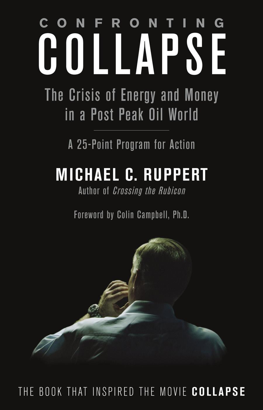 In Confronting Collapse, author Michael C. Ruppert, a former LAPD narcotics officer turned investigative journalist, details the intricate connections between money and energy, including the ways in which oil shortages and price spikes triggered the economic crash that began in September 2008. Given the 96 percent correlation between economic growth and greenhouse gas emissions and the unlikelihood of economic growth without a spike in energy use, Ruppert argues that we are not, in fact, on the verge of economic recovery, but on the verge of complete collapse.