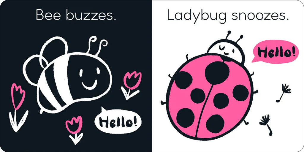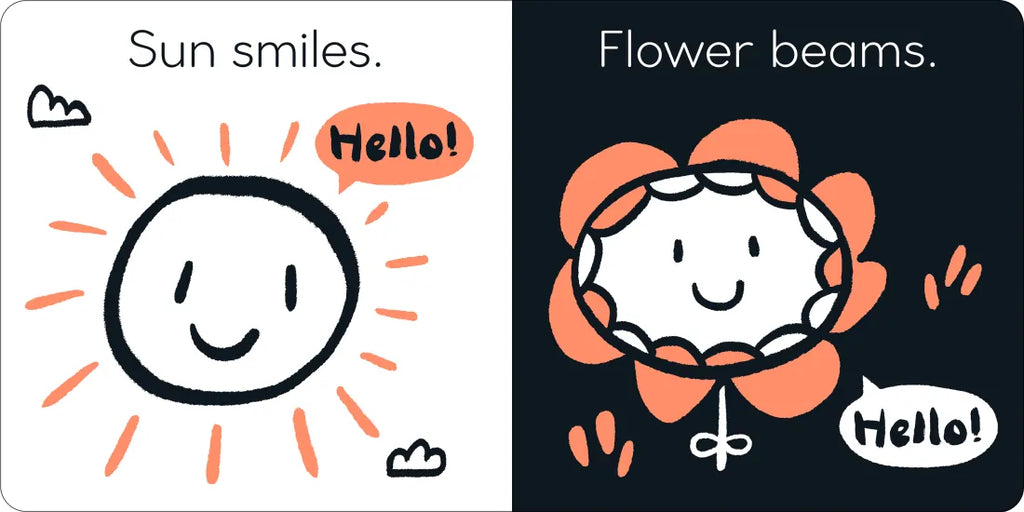 Babies will love to experience the appealing, high-contrast black-and-white images in this engaging board book. With a tactile die-cut cover and super-bright fluorescent inks on every page, which feature simple black-and-white illustrations, this series has been specially designed to capture your little one's attention. Babies will meet a host of friendly, familiar characters, such as the sun smiling and saying hello, a cheerful flower, a happy bee, a sleepy ladybug, and more fun creatures and sounds.