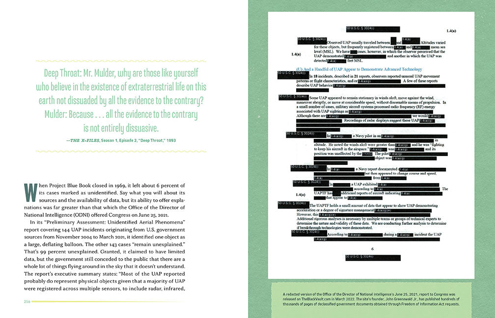 - Governmental and military findings, from Project Blue Book to reports of UFOs at nuclear weapons sites