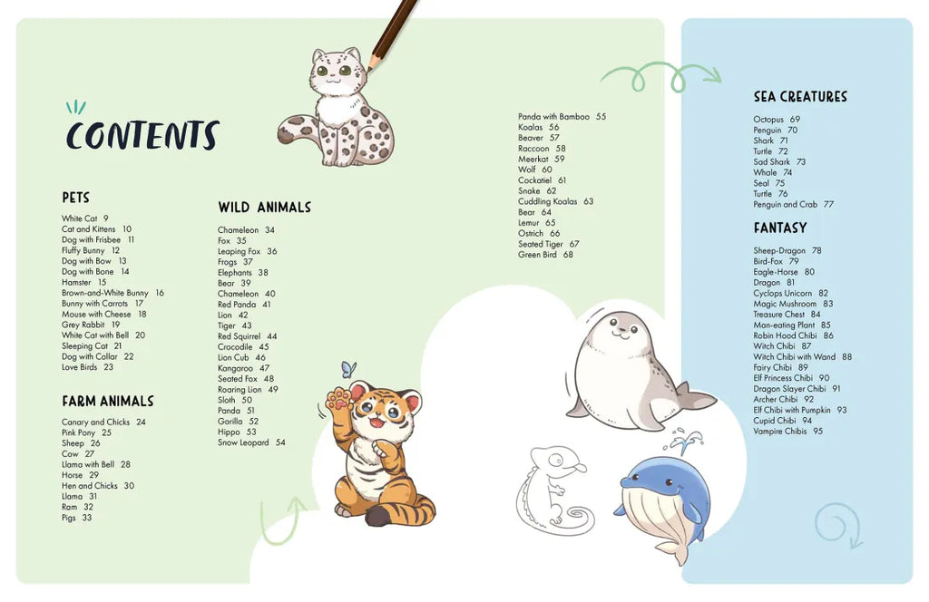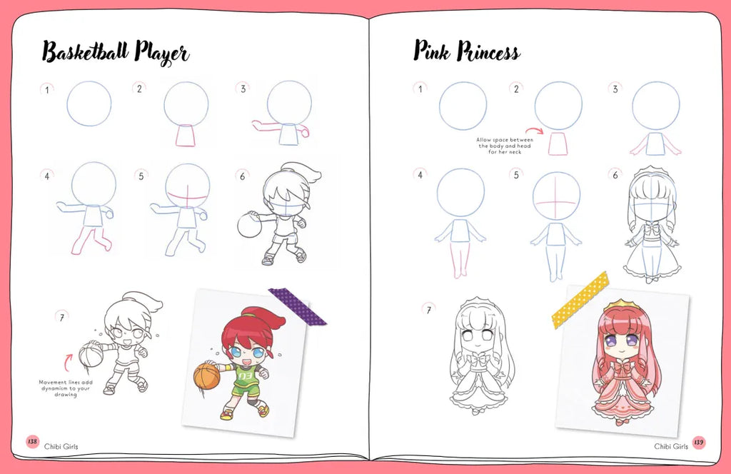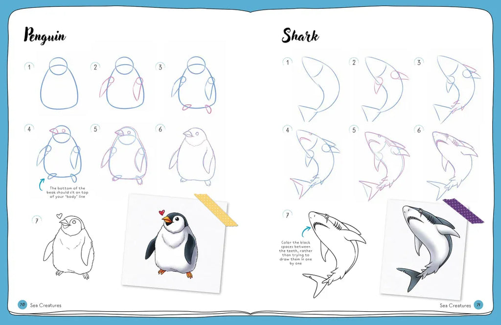 Grab your pencils and get busy sketching this bumper collection of 200 super-cute, fun and friendly drawings! Each of these 200 cute drawings has 7 or 8 simple steps: the firstshape is drawn in blue, then new shapes are added in pink. Black lines areused for the final drawing, then the completed image is fully colored.