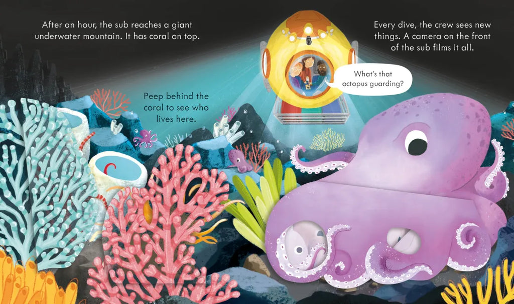Lift flaps and peep through holes to explore with a little sub on a deep-sea dive. Find out how the sub works by opening it up and peeping inside at the cockpit and the ballast tanks, and help the crew collect deep-sea samples using the mechanical arms. There's lots to learn about marine life, too - investigate what an octopus is guarding, meet a hammerhead shark and switch off the sub lights to see all the glowing creatures in the dark.