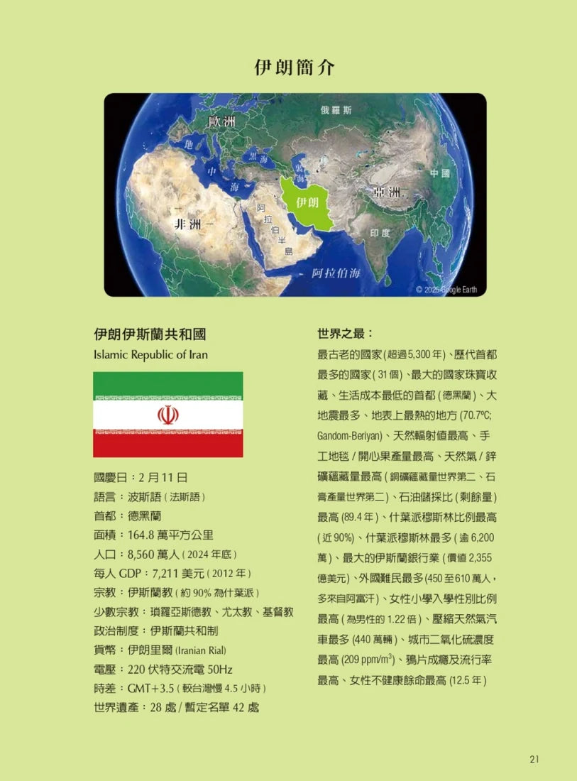 作者林婉美曾赴伊朗旅行導覽近40次,追尋看不盡的聞名歷史現場與文化古蹟,探索偉大的阿契美尼古波斯帝國與薩珊王朝新波斯帝國留下的蛛絲馬跡,走遍波斯與西亞文明的發展史。藉本書帶領讀者走一趟精彩的文化朝聖之旅,實際深入探訪這塊飽受外界誤解與排斥的神秘土地。伊朗是一處旅人感性與知性皆可盡興之地,喜愛旅遊、愛好古文明的人士已經錯過太久了,本書將為您開啟一扇充滿驚喜的大門。