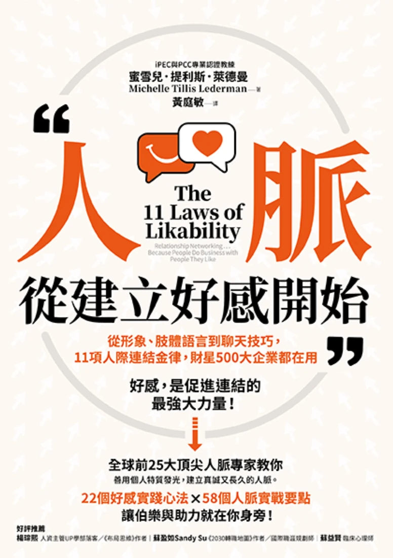 本書作者蜜雪兒.提利斯.萊德曼是知名人脈專家,也是安永、嬌生、花旗銀行等財星500大企業合作的金牌講師。從多年的實戰經驗中,蜜雪兒發現,好感能帶來人脈,更是長遠關係的基石。本書集結作者闖蕩多年、歷練有成的11大好感連結心法,收錄超過40個真實案例,22項實戰練習。無論外向、內向,都能發揮本色,從利己到利他,讓人脈又深又廣!