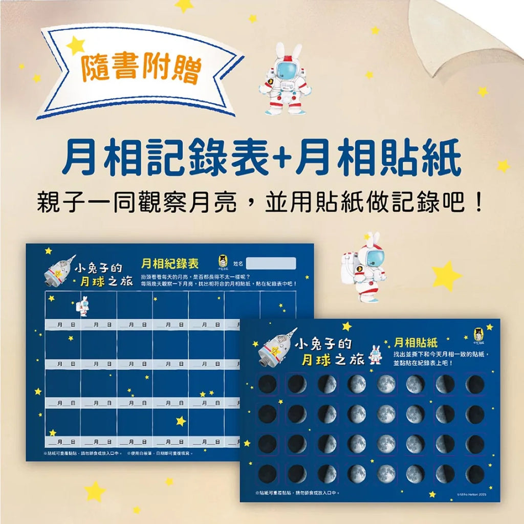 ※隨書附贈「月相紀錄表」搭配「月相貼紙」,親子一同觀月,並用貼紙記錄月亮的變化吧!(紀錄表尺寸:19×25cm,貼紙尺寸:14.8×21cm)
