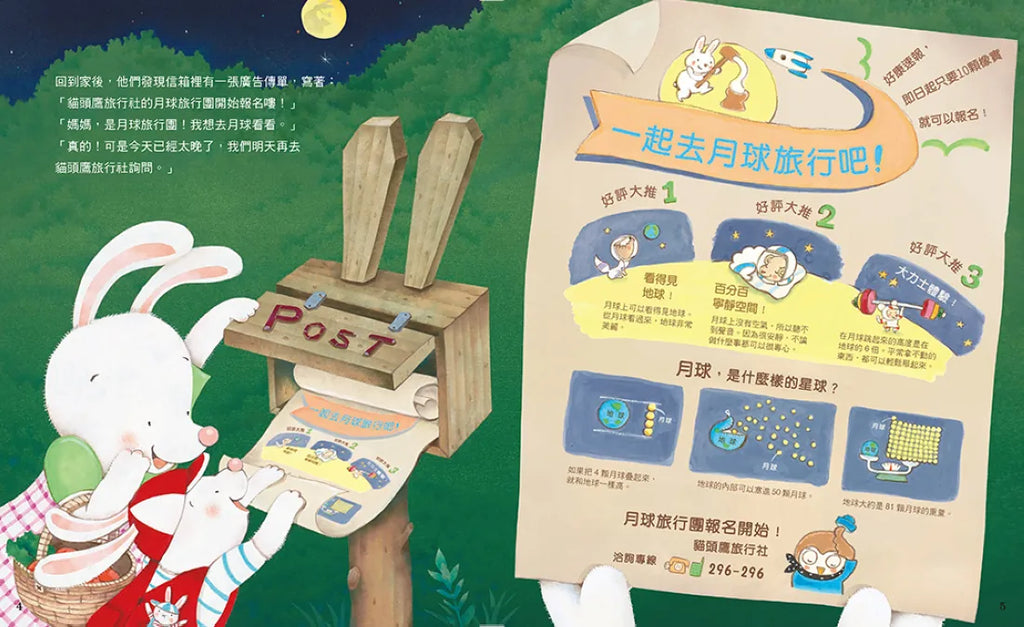 小兔子路那想要出發拜訪這位遠在月球的朋友,於是參加了貓頭鷹月球旅行團,詳讀了月球旅行指南。