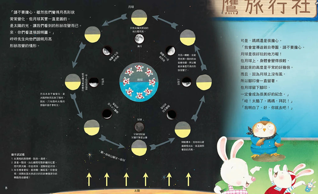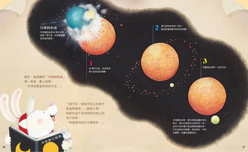 現在小兔子路那認識了月球的形成、月相的變化、月球引力造成的潮汐效應、月食與日食的原理、月海的形成過程……只要等到下一次滿月,帶著月球地圖,月球之旅就要啟程。好讓人期待啊!
