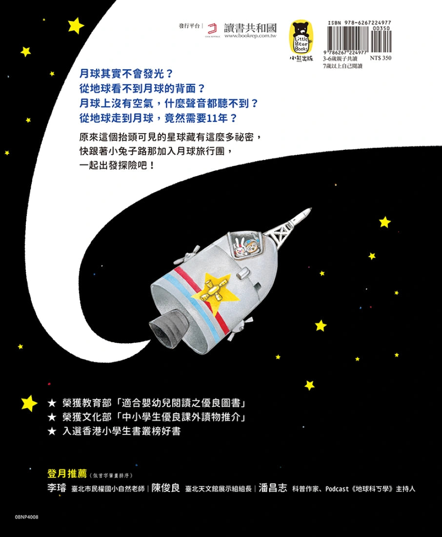 一翻開《小兔子的月球之旅》,看到兔子母子在月光下散步,伴著影子隨行,就回想起第一次發現月亮竟然可以照出影子的驚喜,閱讀繪本讓我重拾起當初學到天文新知的喜悅,書中除了豐富的月球知識,故事中旅行的飛行過程與登月注意事項更是有趣,好奇嗎?趕緊跟著小兔子一起去月球旅行吧!——李璿(臺北市民權國小自然老師)