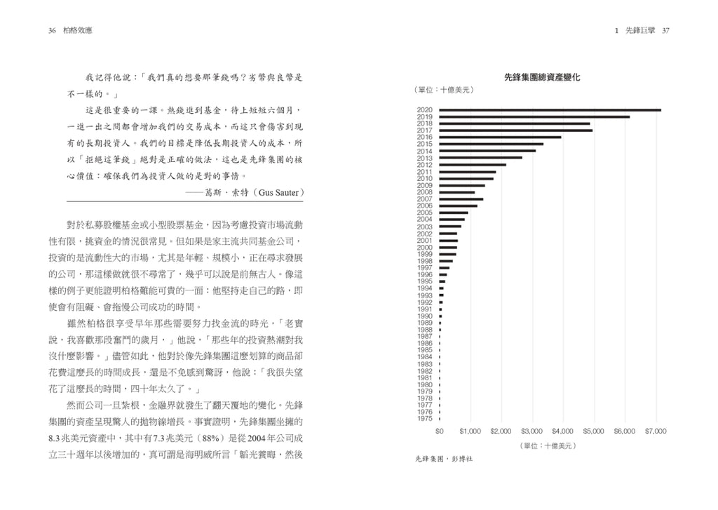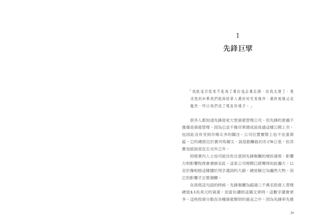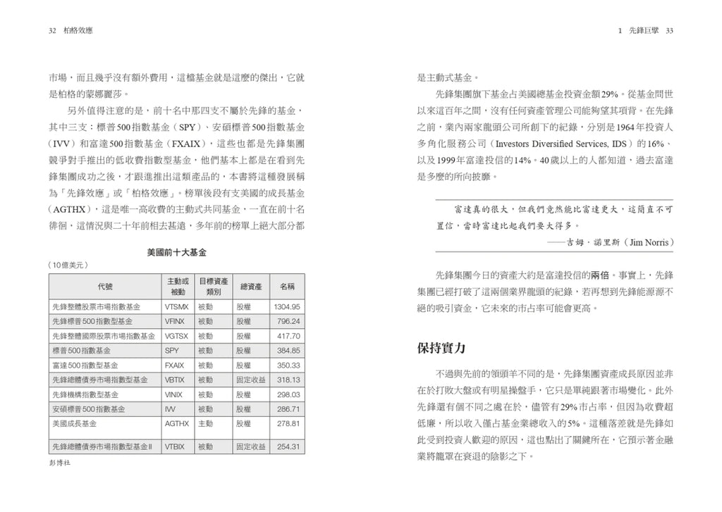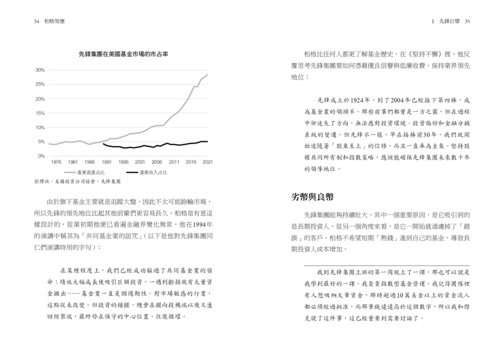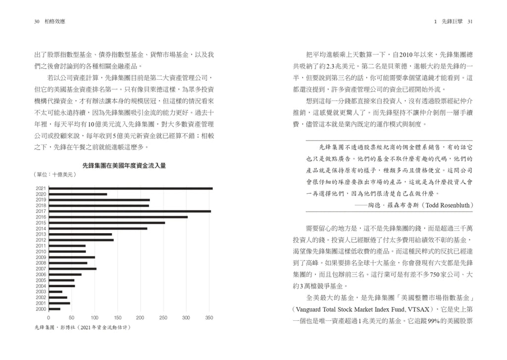 「這是個引人入勝的故事,描繪了基金業百年難得一見的領導型人物,也敘述了被動投資的誕生,以及後續引領而生的革命。」