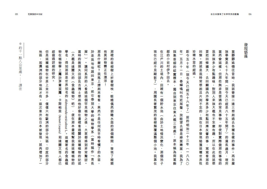 本書精選牧野富太郎極具代表性的植物隨筆,搭配可窺見其個性與生平的自傳性文章。牧野在25篇談論植物身世、也談論己身經歷的文章中,親身示範了如何用靈動的發掘之眼,看出周遭植物的獨特況味。