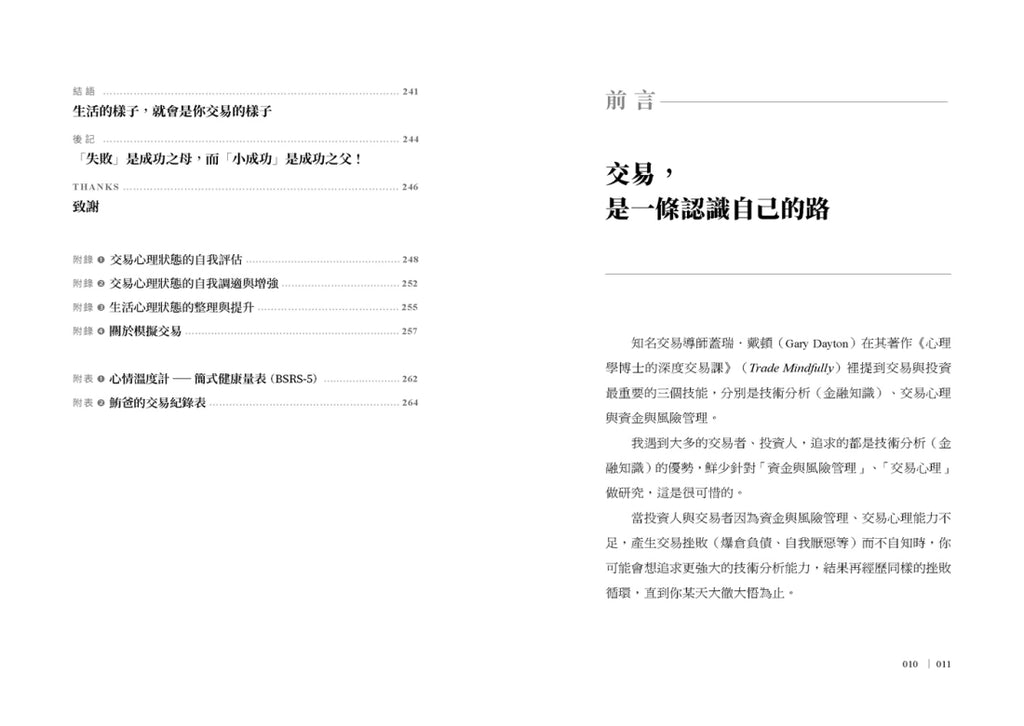 高中畢業後開始學習投資理財,並進入心理學系就讀。22歲畢業時慘賠破百萬,再逐漸從交易市場爬起來,對交易者與投資人會遭遇到的歷程深有體會。在長達10年的心理學修練與大起大落的投資交易路上,最深的體悟就是「交易與生活一體兩面」,你在生活中的心理狀態與特質,同樣會反映在你的交易上。