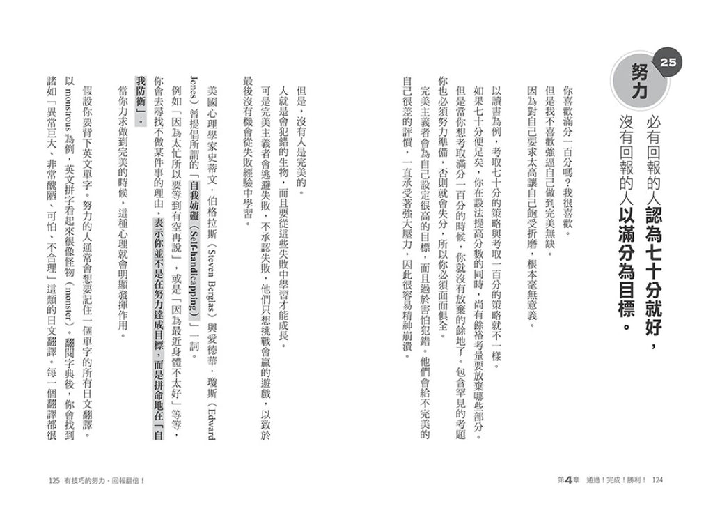 有效努力的人都懂得「如何偷懶」,每週為自己訂下「欺騙日」好好放鬆,充電後再出發。制定努力目標時,他們通常不採取和多人競爭的戰略,會好好思考「獨占的優勢」,在沒有眾多競爭者的情況下輕鬆取得勝利。