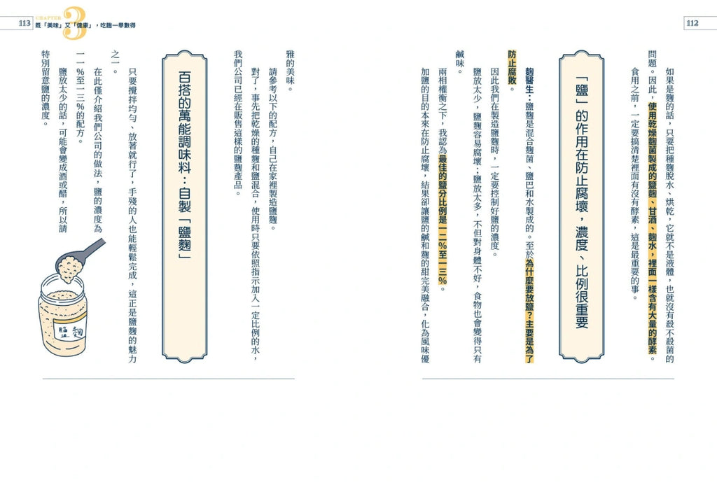 2. 天然美味的12道麴食譜:百搭的萬能調味料「鹽麴」、消暑解渴的活力飲料「甘酒」、內服外敷效果一級棒的「麴水」,在家就能輕鬆DIY,一舉數得。