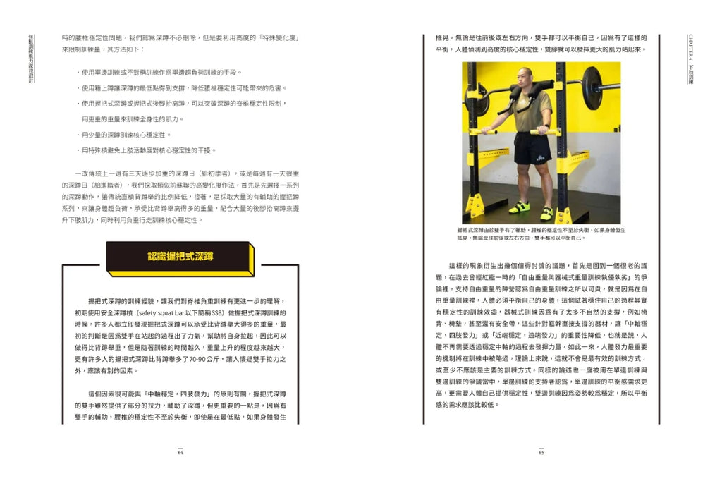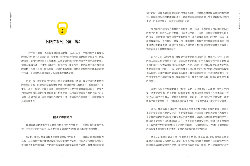 本書採用漸進式的論述教學,從第1部訓練及動作原理出發,深入解析呼吸法的重要性、動作選擇的原理原則,並在第2部詳細解剖並示範各動作類型的要領、作用,讓你理解什麼樣的動作訓練,會讓身體產生哪些反應和功效。最後,在第3部進入課程設計的殿堂,完整學習掌握肌力體能訓練之中,最需要靈活變通的創造性技術──針對長期目標規劃,設計每一天的課程菜單。