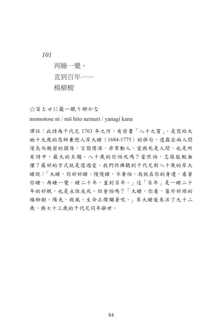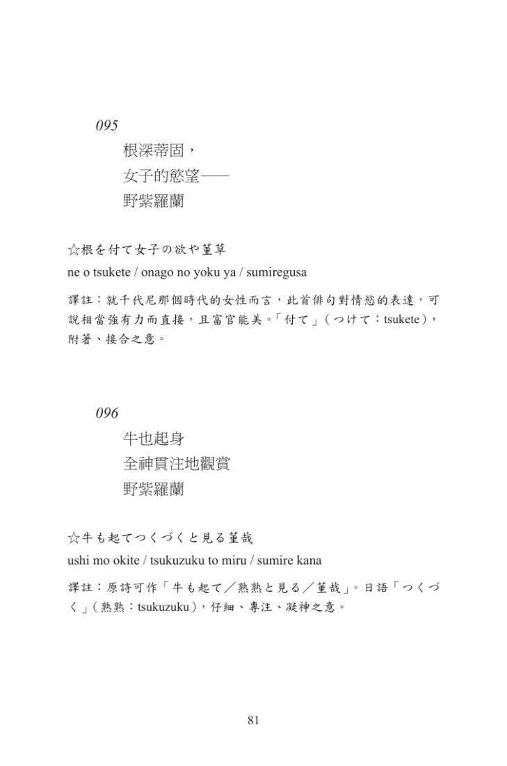 本書從千代尼創作的約1900首俳句中,精選出300餘首傑作,按照日文原典分成新年、春、夏、秋、冬等輯,並附上原文、讀音及註解,供讀者品味鑑賞。