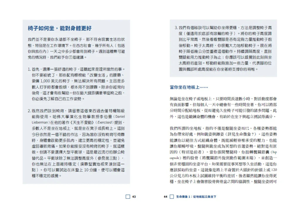 而是幫助你發現,在人體的長遠運作上,日常活動方式的影響比健身還要根本,而且,在客廳裡及辦公桌前就可以練好。