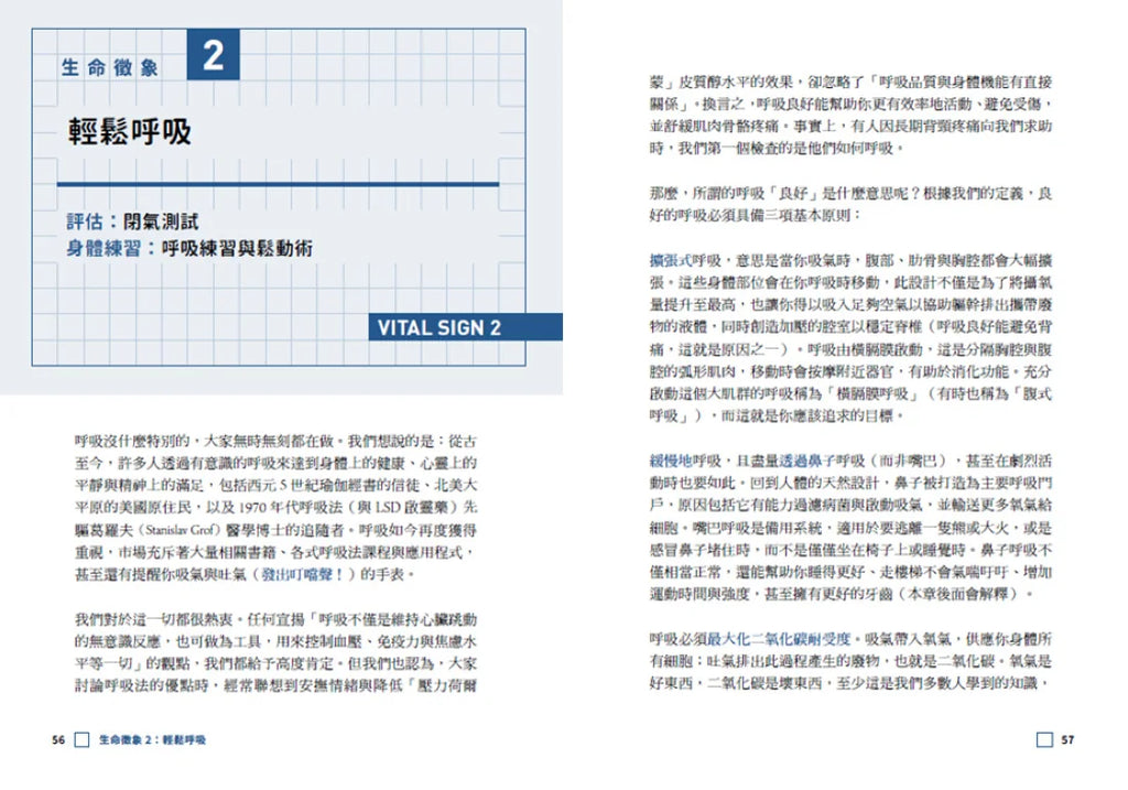 氣吐光後,你可以憋住30秒不吸氣嗎?下午總是昏昏欲睡嗎?呼吸會影響肺活量和血氧濃度,而這兩者又分別決定了你的體力和腦力表現。如果呼吸總是短促,交感神經便持續亢奮,導致身體長期處於緊張狀態,不只難以入睡,更會引起各種不適和疼痛。