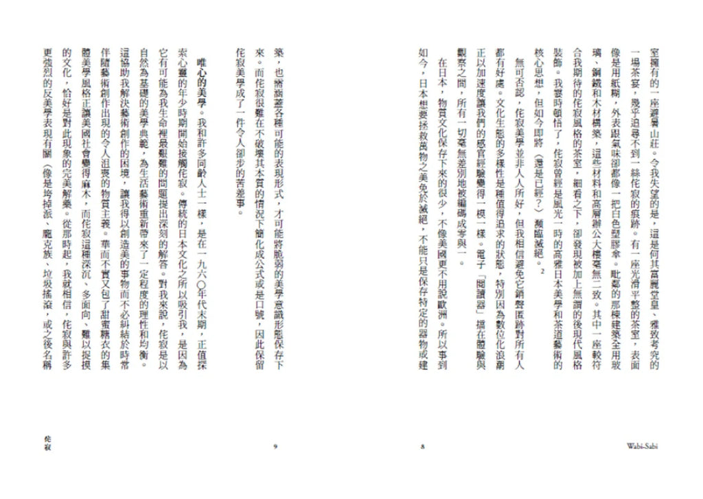 從茶道與禪學發展出的「侘寂」,一向以概念玄奧聞名,連日本人自己都難以說明,不具備日本文化底蘊的外國人更如霧裡看花。本書在1994年首度以一般人可以理解領會的方式把侘寂的概念帶到歐美眼前,嘗試用清楚的言詞說明,也和西方世界熟悉的現代主義做比較,進而促使這個概念從學術與文化圈普及到藝術設計、生活方式、人生態度等領域中。於是從90年代起,在歐美的平面與工業設計、製造業、建築界內,本書激發許多創作者的靈感,甚至在科技產業促發「簡單質樸」的企業理念,帶起一波探討、實踐侘寂概念的風潮。