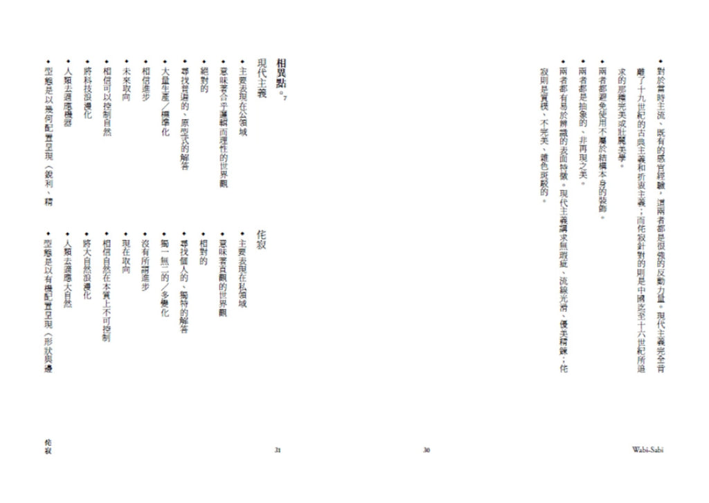 即便侘寂精神得以發揚光大的原因,和特殊的美學表現密不可分,但若檢視侘寂的根源,細嚼其核心論述,我們便可以得知,侘寂的完整型態可以是一種生活方式、一種思考模式、一種對既存主流意見的反動態度,要求我們對於生命、對於藝術創作、對於消費社會,以主動關注遭忽視的細節、摒棄框架再詮釋的態度面對,終能達致不矯飾而優雅的侘寂智慧。