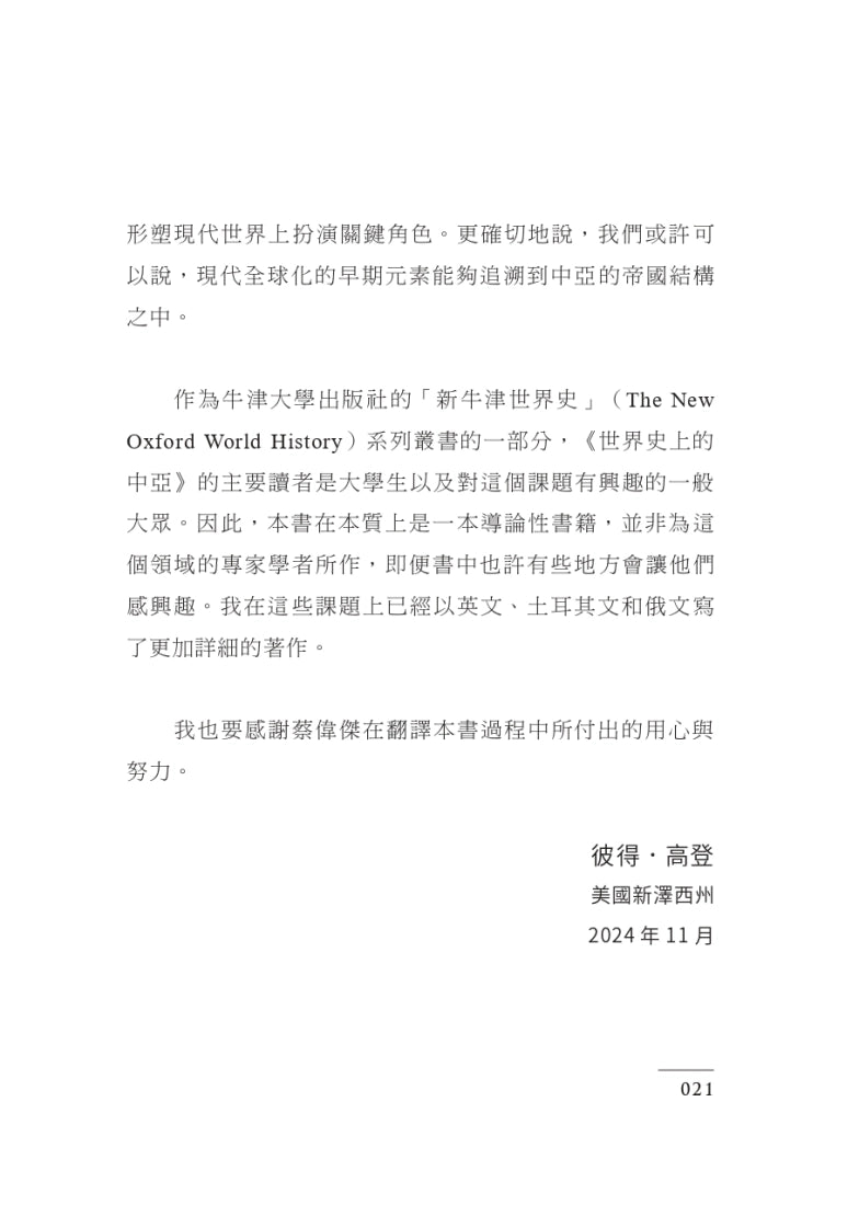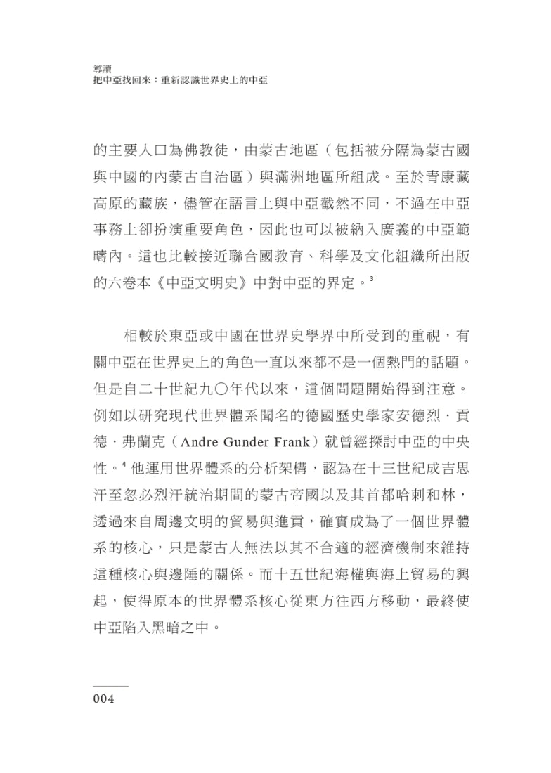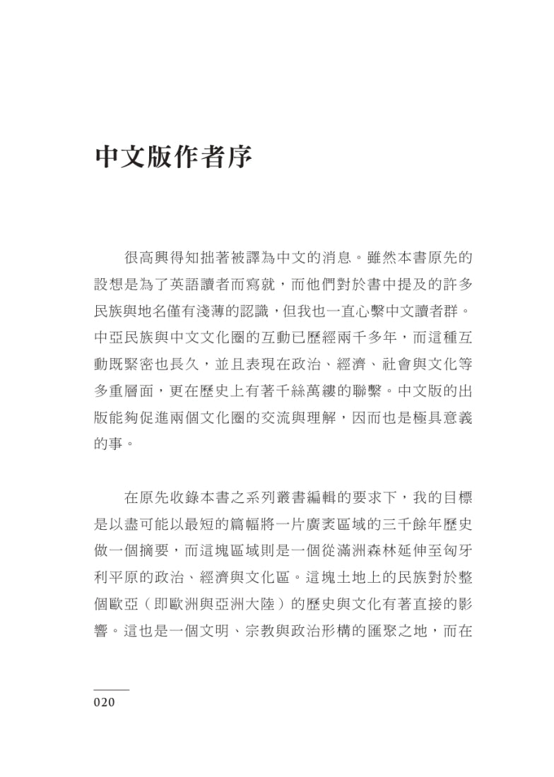 一、本書對於中亞不採狹義之「中亞五國」界說,而採取廣義定義,納入從滿洲森林延伸至黑海周緣此一廣袤地帶自上古至現代四萬年的歷史,可謂一部中亞的「大歷史」。