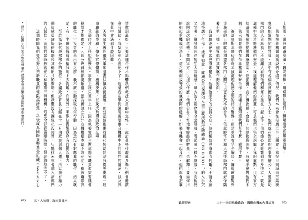 她初抵布魯塞爾時,對於國際外交尚屬新手,面臨著在記憶中最動盪的時期,代表二十八個國家的觀點和價值觀的挑戰。幾十年的確定性在幾天內被一掃而空,希望在幾小時內升騰又跌落。從烏克蘭的凍結衝突到塞爾維亞—科索沃協議,她經歷了挑戰、失敗和成功的時刻。