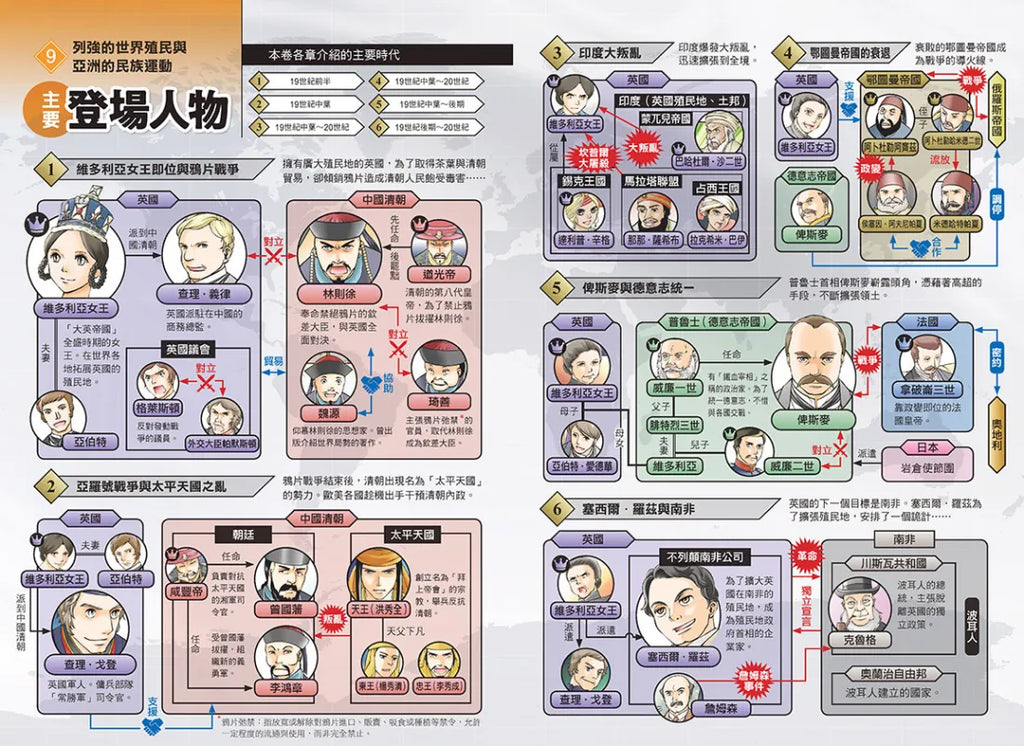 「漫畫故事」為全書的主軸,以歷史劇場呈現,並加入注解和趣聞。放眼英國維多利亞女王即位與俾斯麥擔任德意志首相後的世界,講述歐洲列強如何利用貿易、軍事等手段,達到打開中國門戶、殖民印度與非洲、侵占鄂圖曼帝國領土的目的。透過清朝林則徐、印度占西王國王妃、鄂圖曼大宰相米德哈特帕夏等力挽狂瀾的重要人物,深入了解非洲、印度等亞洲的殖民地化與民族運動史。