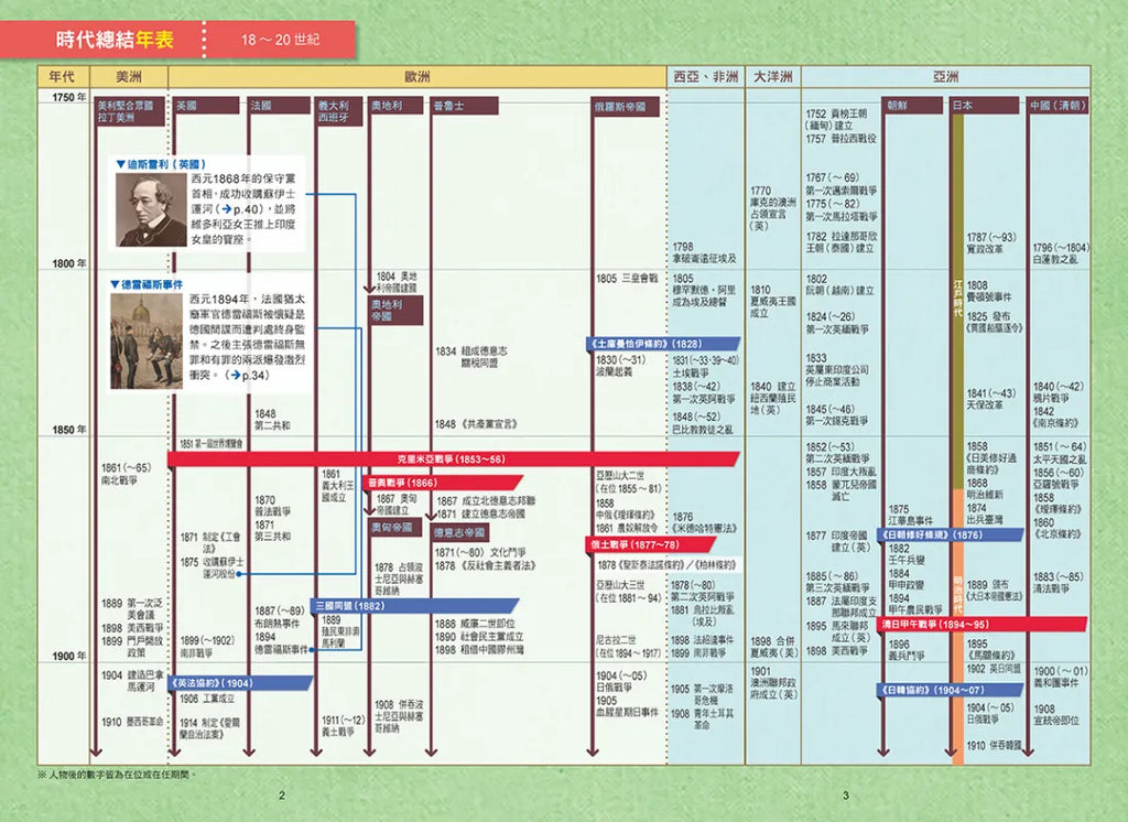 「歷史知識」是設計於漫畫故事之後的附錄,以「時代總結」和「世界史聚光燈」單元整理學習重點,讓讀者更深入理解漫畫內容,並提供18~20世紀的年表、約19世紀和19世紀後半~20世紀初期的世界地圖,以及大量的補充說明、語詞解說、區域地圖、歷史照片,還充滿趣味的介紹南丁格爾在克里米亞戰爭中推動的醫院改革、中國百姓反抗暴政的行動、非洲的獨特文明發展、蘇伊士運河的建造等。