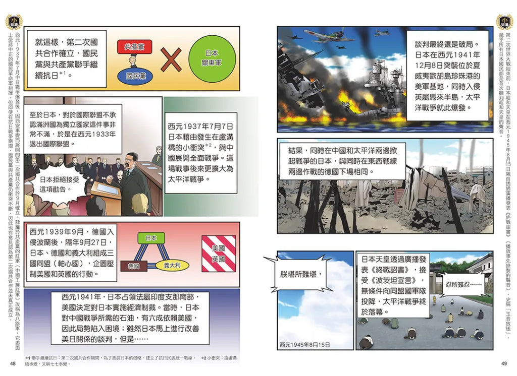「歷史知識」是設計於漫畫故事之後的附錄,以「時代總結」和「世界史聚光燈」單元整理學習重點,讓讀者更深入理解漫畫內容,並提供20世紀的年表、第一次世界大戰後和第二次世界大戰中歐洲、亞洲與太平洋的世界地圖,以及大量的補充說明、語詞解說、區域地圖、歷史照片,還充滿趣味的介紹什麼是泡沫經濟、希特勒高人氣背後的洗腦宣傳、破壞力如此可怕的原子彈如何開發出來等。