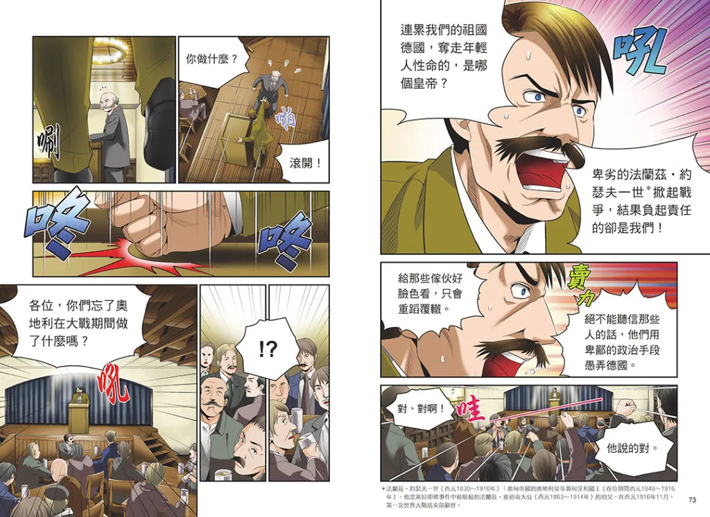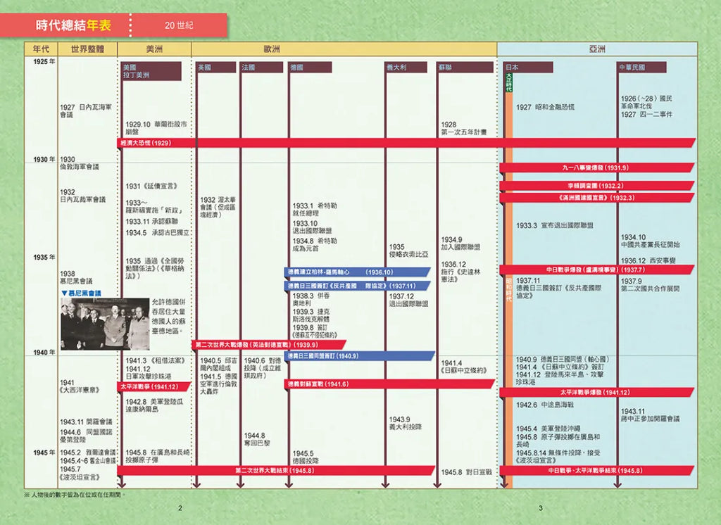 「歷史綜合分析」藉由精采的全彩照片,圖説第一次世界大戰後日、美、英、法、蘇聯、德、義等各國採取什麼政策面對嚴峻的經濟危機及其影響;而「主要登場人物」以圖解標示出漫畫故事裡的角色身分和立場,讓讀者更好了解他們之間錯綜複雜的關係。