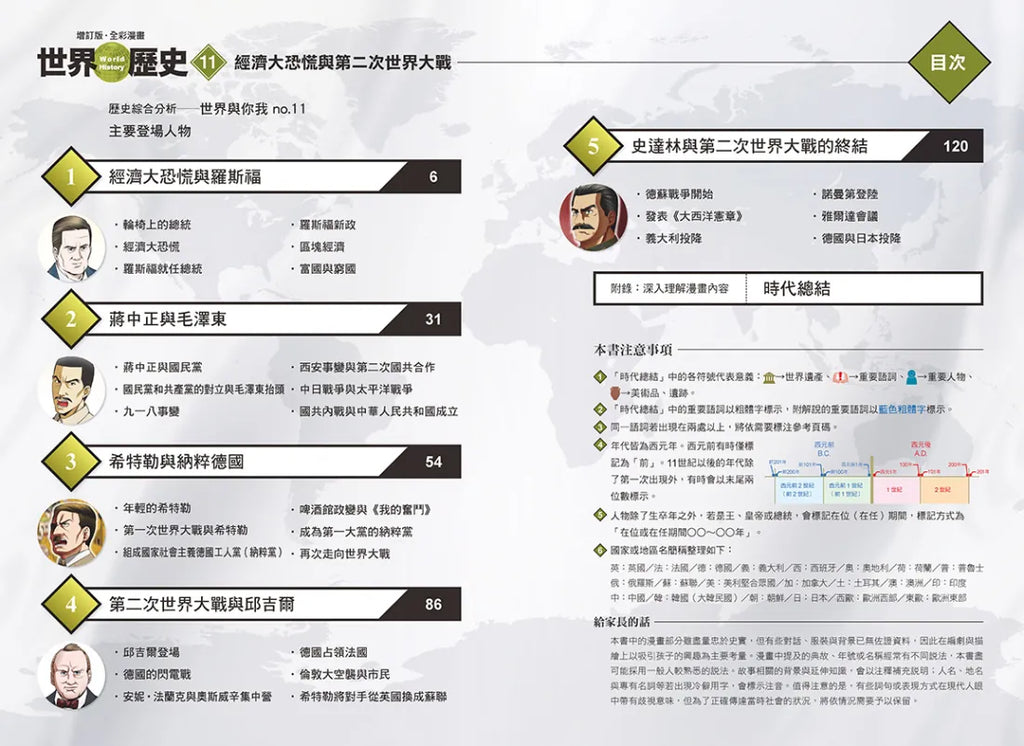 《增訂版全彩漫畫世界歷史.第11卷:經濟大恐慌與第二次世界大戰》全書分為「漫畫故事」與「歷史知識」兩個部分,更在進入漫畫故事前,特別設計「歷史綜合分析」和「主要登場人物」兩個單元。