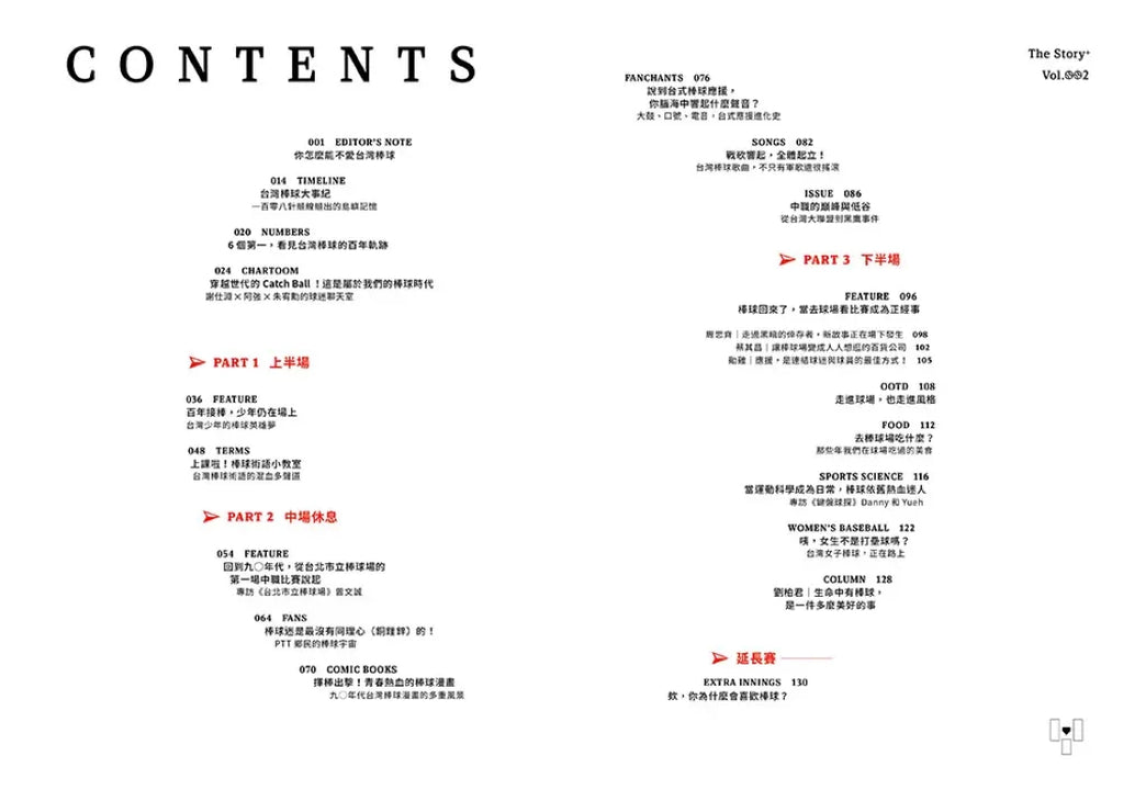 本期的《故事別冊》就是在記錄這段旅程,從百年前的模仿時代到今天職業聯盟,我們不只聚焦場內,更要看棒球如何溢出球場之外,融入生活的各個層面,成為台灣跨世代的認同,不論是看球時的穿搭、美食,鍵盤球迷的毒舌術語,還是音樂、漫畫、應援團、啦啦隊⋯⋯當你看完這一切的加總,或許也會忍不住說: