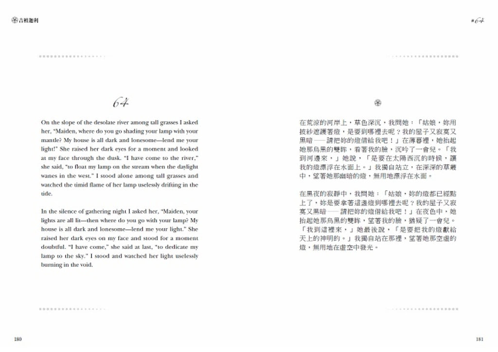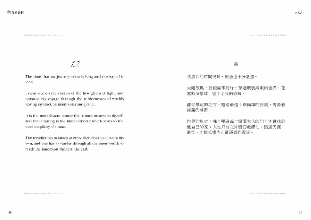 本書為中英對照全新譯本,搭配精美彩色插畫,以精裝型式再現原著的意境和神韻。「Gitanjali」在孟加拉語中是「獻給神的讚歌」。在無垠的時光荒野裡,送一首美好的詩給自己當禮物吧。