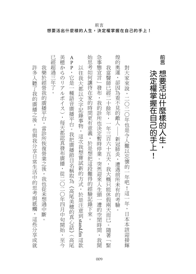 女性由於角色關係,在人生各階段經常面臨不同力量與情緒的拉扯,20、30、40、50、60世代各有不同的情況和問題需要面對。行醫超過二十年的高尾醫師,長年看過不計其數的女性個案,深刻了解女性在不同階段各方面的身心困擾。透過本書,她提出「真心話」建議,積極守護在每個崗位上為了幸福努力生活的姊姊妹妹,以及身旁陪伴的他/她。