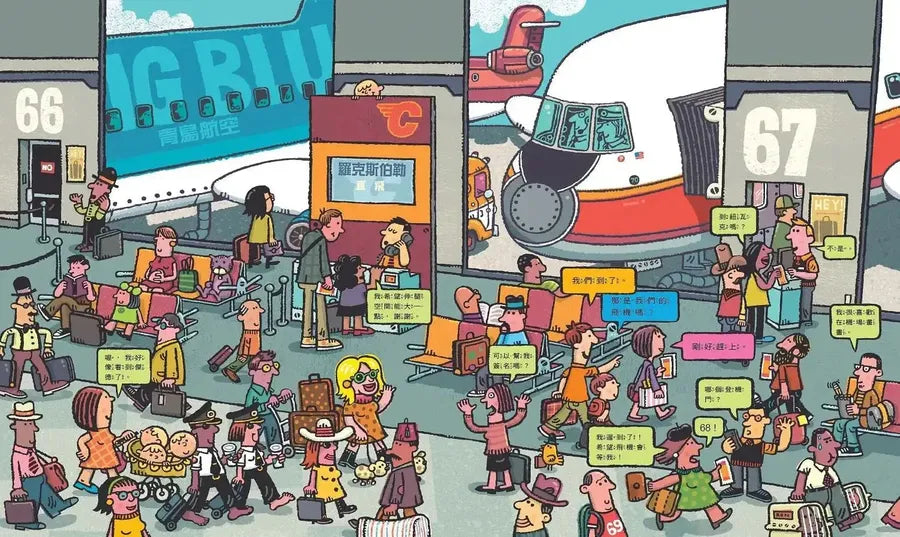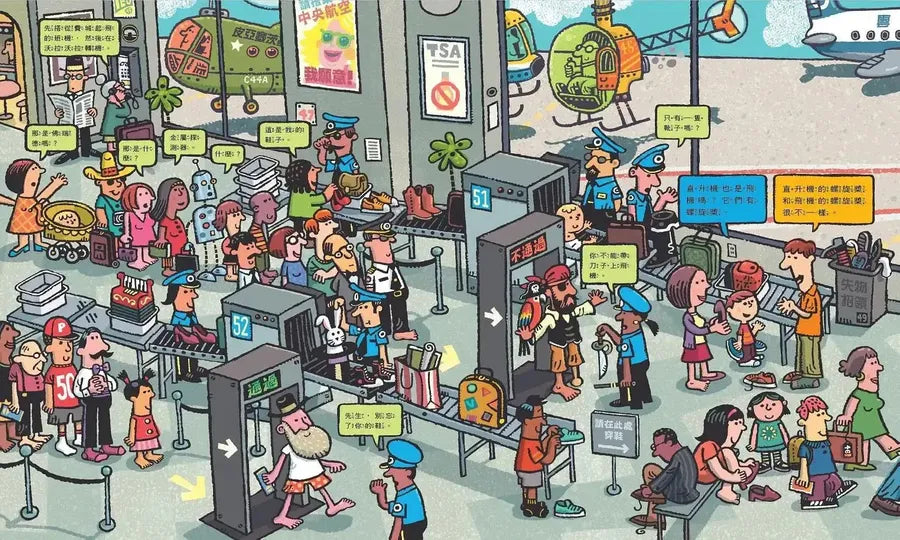 亨利和爸爸、媽媽一起開著小紫車出發,要到機場搭飛機。在繁忙的機場裡,他們從大廳到櫃台報到、通過安全檢查、抵達登機門,最後登上班機起飛。這一路上,他們學到了許多關於飛機和空中旅行的知識,看到了各式各樣的噴射機、飛船、直升機、滑翔機……令人眼花撩亂。不僅如此,亨利還看到許多戴帽子的小鳥,發現可以從1數到100,而且注意到一些不應該出現在那裡的奇特東西,像是機器人、海盜、超人,還有機場裡形形色色的人群等。書裡有好多小故事、玩不完的找找看、許許多多有趣的細節,以及五張噴射機、飛船、直升機、滑翔機等飛行器的剖面結構圖,與一張可以鳥瞰機場、擠滿車輛和各式飛機的超大拉頁!