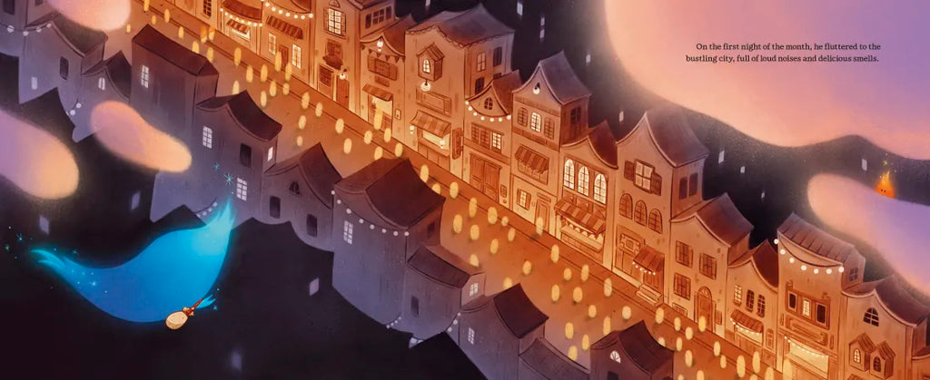 Gwei the ghost is absolutely famished, but unlike the other ghosts in the cemetery, he won’t eat just anything. Luckily, it’s Ghost Festival month: the one time a year when ghosts roam the realm of the living. Gwei flutters around the city eating steaming bowls of noodles, hot, hot, HOT chestnuts, and crispy fried fish with chili oil.
