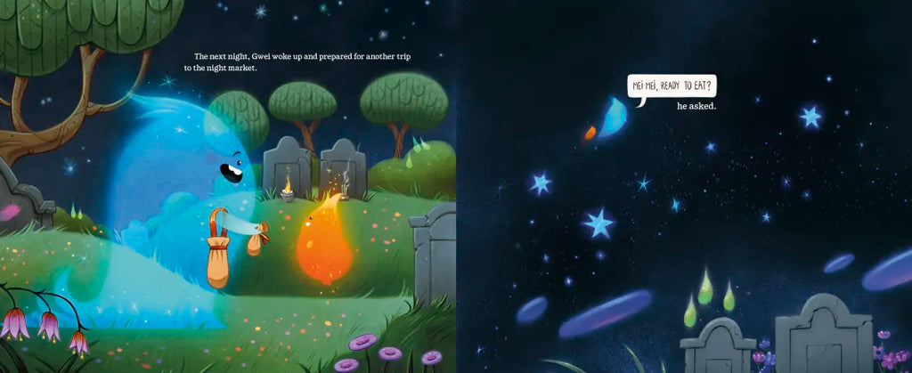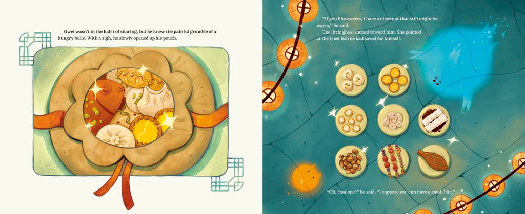 Yet no matter how much Gwei eats, his hunger won’t go away. As he searches for the perfect meal, he catches someone following him. It's another hungry little ghost! When he hears her grumbling belly, he reluctantly reaches into his pouch to share. To his surprise, he finally starts to feel full.