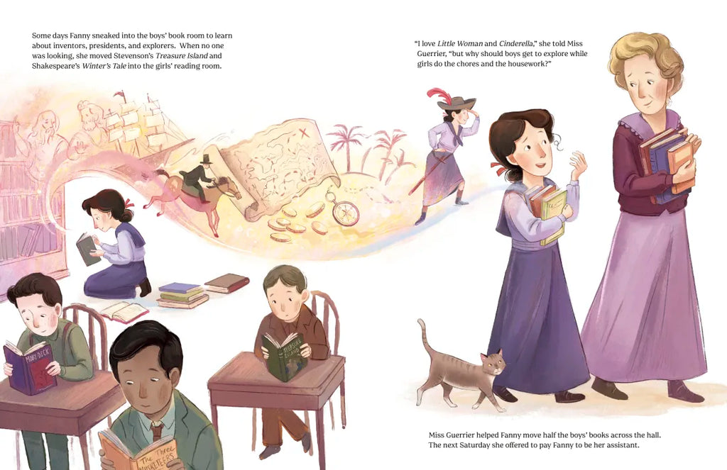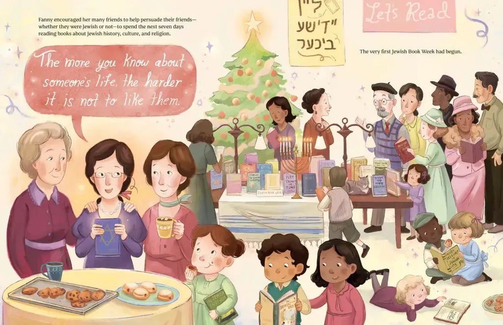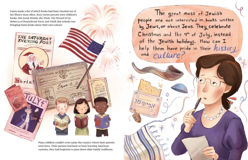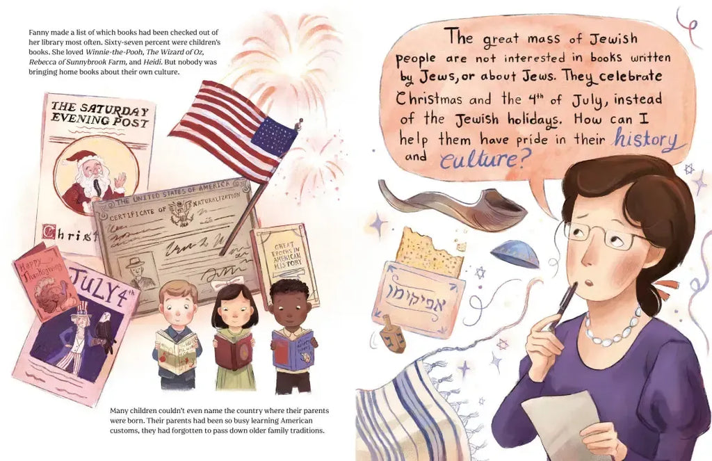 Fanny Goldstein immigrated to America from Russia when she was six. She loved the fact that in her new country she could borrow books for free and take part in all kinds of activities at the Saturday Evening Girls Club. Right away, her curiosity attracted the notice of the club's founder, who was also the head of the Boston Public Library. It wasn't long before Fanny was hired as the librarian's assistant, and then at thirty-three, as the first Jewish director of a Boston branch library. And when Fanny noticed how rarely Jewish families checked out books about their own history, she had an idea that would influence libraries and readers for decades to come: She decided to host a week-long party to celebrate Jewish books and culture. It was such a success that it launched a national event which has continued for 100 years!