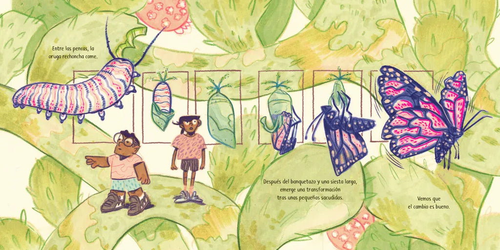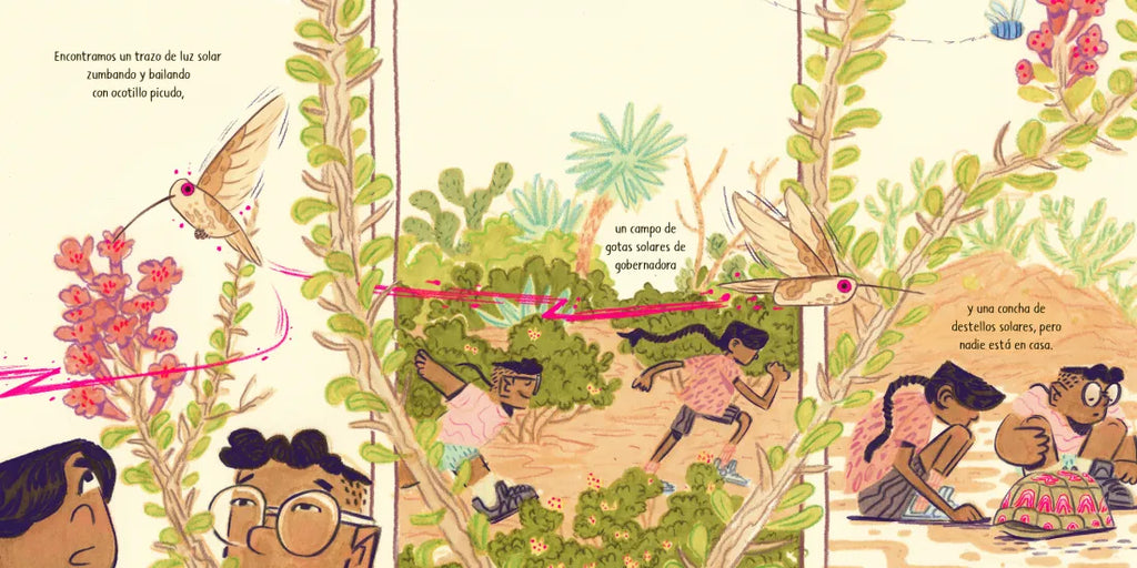 El desierto alberga flora y fauna única que se ha adaptado a vivir bajo el sol intenso, haciéndole un paisaje sin fin para el libre andar de dos hermanes curioses. Llantas viejas descartadas, nopaleras antiguas que piden ser escaladas, rocas enormes que enseñan cómo aquietarse y escuchar. La lluvia trae un bienvenido alivio del calor, seguido por el lodo que lentamente se seca en la piel, cuarteándose como barro, llegando al punto donde es difícil saber dónde terminan los niños y dónde empieza el desierto.