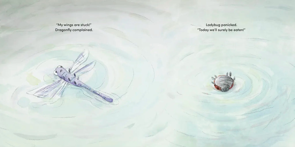 Ladybug and Dragonfly are caught in a storm, floating upside down and helplessly on the river. They are certain that today they'll be eaten.
